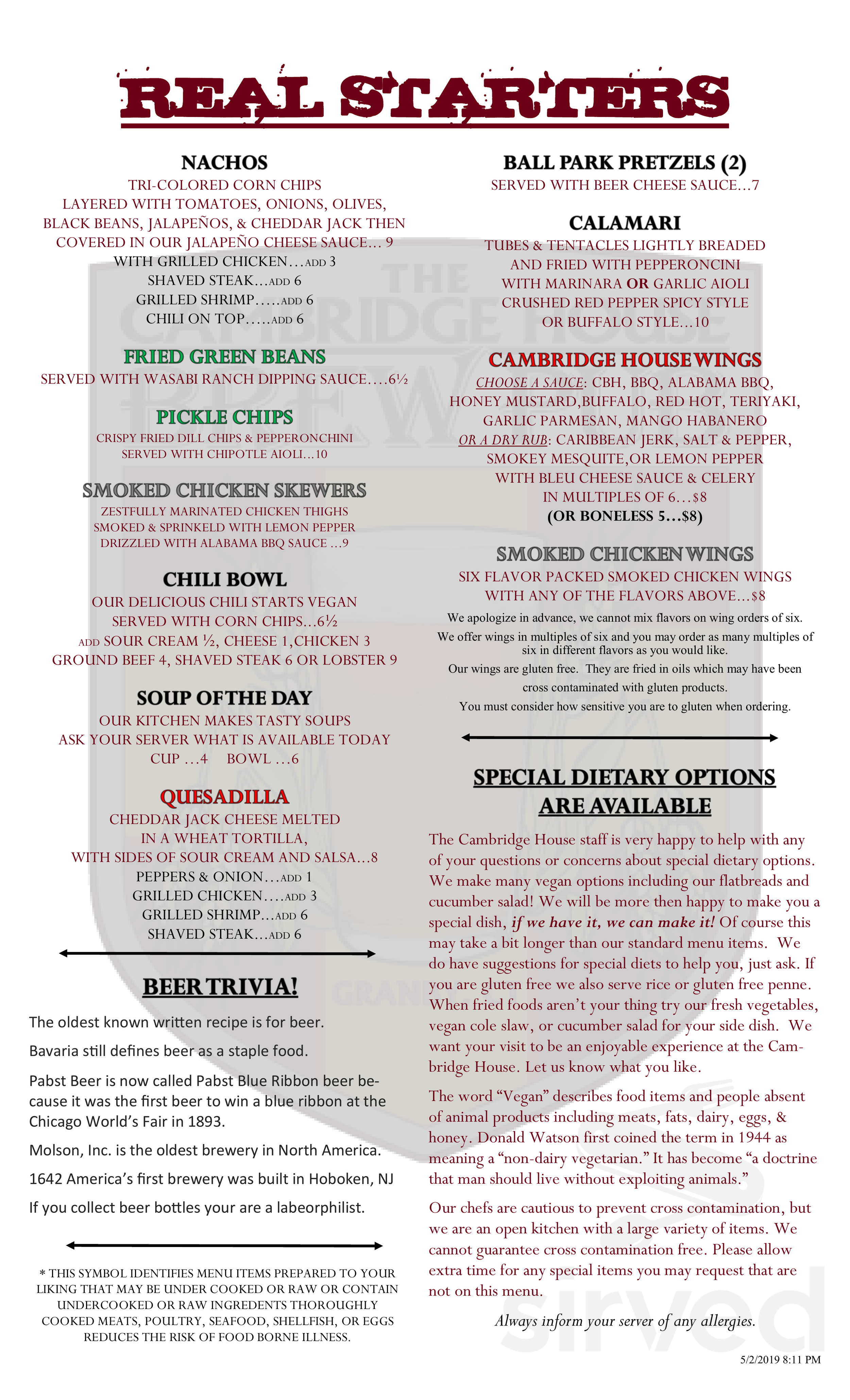 Cambridge House Brew Pub Menu In Granby Connecticut Usa